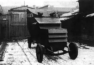 ![]() Бронеавтомобиль «Руссо-Балт» Братолюбова — Некрасова (тип II) у ворот мастерской Братолюбова. Петроград, 1916 год. | |