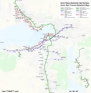 İZBAN (ранее известный как Egeray) представляет собой систему пригородных электричек, обслуживающую Измир и его столичный регион, в основном по оси север-юг, по двум линиям: Северная линия и Южная линия. В среднем ежедневный пассажиропоток составляет 185 000 пассажиров, это самая оживленная система пригородных поездов в Турции, немного опережающая линию пригородных перевозок Мармарай в Стамбуле .[1] İZBAN — это аббревиатура из слов « İzmir» и « Banliyö» (пригород на турецком языке).