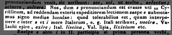 Во второй половине XIX века, когда румынская латиница только сформировалась и вытеснила кириллицу, буквы с седилью (ş) и запятой снизу (ș) использовались взаимозаменяемо. В книге Ortografia limbei române, определившей румынскую орфографию того времени и опубликованной Румынской академией, упоминается, что с буквами s и t используется седиль.