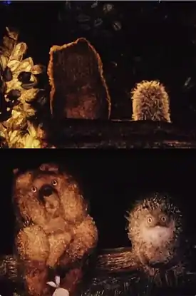 Для съёмок эпизода с деревом, которое воспринимается Ёжиком как крутящаяся громада, были подготовлены отдельные фрагменты, прикреплённые к ярусам. Лежащие на целлулоидах нарисованные ветки во время работы камеры медленно вращались, создавая ощущение поворота ствола вокруг своей оси, тогда как он на самом деле оставался неподвижным. Другая сцена — «Летающие мотыльки возле дома Медвежонка» — была построена по принципу игры света и тени. Во время съёмок мотыльки находились на одном ярусе, а сидящие на брёвнышке герои — на другом. Лампа направлялась в место скопления насекомых, но струящийся свет был достаточно мягким. При выходе из светового круга мотыльки исчезали, но их порхающие тени падали на Ёжика и его друга[24][51][52].