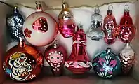 - Место шаров и ангелов заняли самые разнообразные фигурки людей, животных, фруктов, овощей. Разнообразие цветных фигурок на ветвях вообще отличало советские ёлки от западных, где украшения могли быть разноцветными, но обычно единой формы[4].
