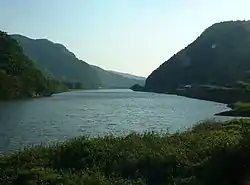 В среднем течении (от плотины Бисямон до плотины Синтавараи[13]), особенно во впадине Цуяма, река приобретает спокойный характер и образует заводи. Вокруг реки лежат заливные поля. У реки растут тростник японский и ива, дальше от воды — сосна густоцветковая и дуб пильчатый. В реке встречаются аю, Opsariichthys platypus, кои, караси, Nipponocypris temminckii, Rhinogobius flumineus, а также редкий вид Coreoperca kawamebari. Из животных для этой части реки характерны чернопятнистая лягушка, светляки Luciola cruciata, Cybister chinensis (Dytiscinae)[12].