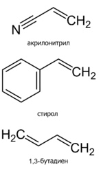 ![]() Химические формулы мономеров, из которых производится АБС-пластик | |