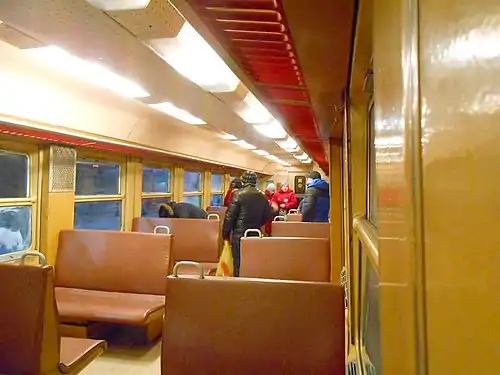 Пассажирский салон вагона АПЧ2 со включённым освещением
