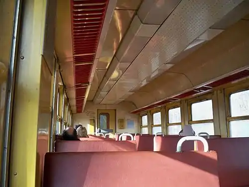 Внутренняя облицовка боковых стенок выполнялась из цветного слоистого пластика. Пол образован крупноразмерными панелями из огнеупорной фанеры, которые выходят вдоль боковых стенок пассажирского купе за высокую кромку полиэфирного слоистого пластика. Потолок в пассажирском салоне составлен из панелей, изготовленных из древесноволокнистых плит, обклеенных со внутренней стороны декоративной плитой ECRONA S. Потолки в тамбурах двухслойные, с ядром из пенопласта, обклеенного с двух сторон теми же плитами ECRONA S, которыми также (с двух сторон) обклеены перегородки, изготовленные из реек[12]. В боковых стенах имеются окна с двойным остеклением с отодвигающейся вниз верхней половиной для открытия форточки. В узких подоконниках имеются вентиляционные решётки системы отопления салона, подогревающими салон в холодное время года тёплым воздухом, нагревающимся от системы охлаждения дизеля в моторных либо от электрических нагревателей в прицепных вагонах[4]. Над окнами вдоль салона к стенам крепятся металлические багажные полки. Пол в первых вагонах имел чёрный цвет[4], у серийных вагонов он стал серым.