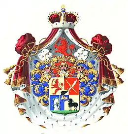 Щит разделён на четыре части, в середине малый щиток. В первой золотой части червлёный лев с червлёной короной на голове, держащий в правой лапе червлёный изогнутый меч. Во второй червлёной части накрест серебряный изогнутый меч с золотой рукояткой и золотой скипетр. В третьей лазуревой части на зелёной земле серебряный столб, обвитый виноградными лозами натурального цвета с зелёными листьями. В четвёртой золотой части на зелёной земле чёрный баран (овен) с червлёными глазами и языком. Малый щиток пересечён на золотое и лазуревое поля. В верхней золотой половине чёрное орлиное крыло, в нижней лазуревой — лежащий золотой лев с червлёными глазами и языком (герб Лазаревых).