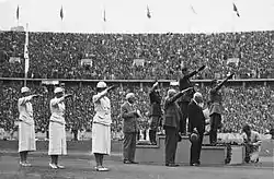 ![]() Церемония награждения призёров соревнований по современному пятиборью на Олимпийских играх 1936, Сильвано Абба — крайний справа на пьедестале почёта | |