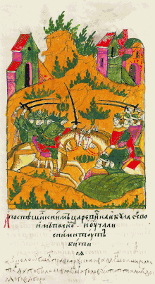 Лицевой летописный свод: «А поспешил к ним царевич Кайбула со своим полком, и начали с ним тут биться, (а вокруг обошёл полком правой руки Иван Меньшой Шереметев, да побили немцев наголову и топтали их до самого Выборга)»