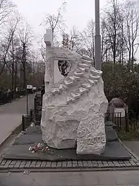 - 29 мая 2009 года на могиле Александра Абдулова на Ваганьковском кладбище был открыт памятник, который представляет собой глыбу серо-белого гранита, с левого края которой возвышается белый мраморный крест. В глыбу вмонтирована плита с изображением Абдулова. Фото взято с кинопроб на роль Ланцелота в фильме Марка Захарова «Убить дракона». Буквы с именем Александра Абдулова выложены в виде ступенек, уходящих вверх. Автор памятника — скульптор Владимир Матюхин. Главная идея оформления принадлежит вдове Юлии Абдуловой и его близкому другу Леониду Ярмольнику[41].