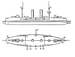 | Спущен на воду | Не достроен, работы приостановлены в 1897 году, окончательно отменены в 1911. |