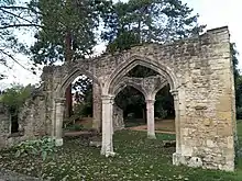 От церкви аббатства до наших дней ничего не сохранилось. Руины в садах аббатства — реконструкция, построенная Тренделлом в XIX веке. Некоторые камни могут быть из церкви Святой Елены[7].