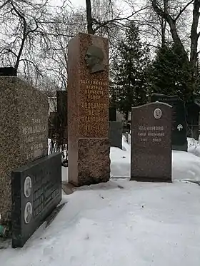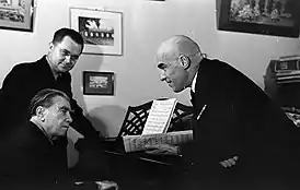 ![]() Создатели балета «Медный всадник»: Р. Захаров (справа), Р. Глиэр (сидит за роялем в центре) и П. Аболимов, 1948 | |