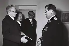 ![]() Посол Абрамов (справа) вручает верительные грамоты президенту Израиля Ицхаку Бен-Цви, 4 декабря 1953 года | |