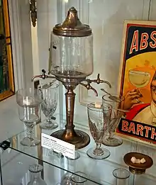 - Известным любителем абсента являлся всемирно известный американский прозаик Эрнест Хемингуэй. В период жизни на Кубе и работы над своим произведением «Старик и море» он заказывал абсент из соседней Флориды и готовил его способом, ставшим классическим, — при помощи специального фонтанчика, пускающего воду тонкой струёй для разбавления абсента. В своей книге «Смерть после полудня» есть такие слова «С возрастом было всё сложнее выходить на ринг, не выпив три или четыре абсента, который, распаляя мою храбрость, несколько расстраивал рефлексы». Также в своём романе «По ком звонит колокол» Хемингуэй наделил главного героя Роберта Джордана привычкой пить абсент по вечерам своеобразным способом, приведённым выше. А в романе «Райский сад» Хемингуэй рекомендует на бокал с абсентом ставить стакан со льдом и маленькой дырочкой внизу, чтобы вода капала постепенно. Писатель даже придумал коктейль «Смерть после полудня» для сборника о любимых напитках знаменитостей. «Налейте одну рюмку абсента в бокал для шампанского. Добавьте ледяное шампанское, немного взболтайте, пока оно не достигнет опалового помутнения. Пейте медленно от трёх до пяти бокалов этого коктейля».[17]