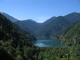 Реки сравнительно коротки, все они принадлежат бассейну Чёрного моря[12]. Наиболее значительные из них (Кодор (Кудры), Бзыбь, Кяласур, Гумиста) многоводны, потенциальные гидроэнергетические ресурсы превышают 3,5 млн кВт. Питание рек преимущественно дождевое и снеговое, имеет место весенне-летнее половодье. На территории Гагрского района протекает самая короткая в мире[13][14] река Репруа — её длина всего 18 м. В горах расположены живописные озёра Рица и Амткел.