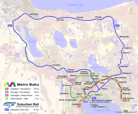Абшеронская кольцевая линия (азерб. Abşeron Dairəvi xətti), прежнее название Бакинская кольцевая линия (азерб. Bakı Dairəvi xətti) — маршрутная линия железнодорожного пассажирского транспорта в Баку с некоторыми (платными) пересадками на метро. Азербайджанские скоростные двухэтажные электропоезда, курсируют от Бакинской до Сумгаитской в двух направлениях проезжая другие пассажирские станции на Апшеронском полуострове. В сторону Сумгаита поезда начали курсировать после завершения в 2015 году реконструкции железнодорожной линии Баку — Сумгаит — Баку[2]. Согласно распоряжению Президента Ильхама Алиева от 22 января 2018 года, линия Баку — Сабунчи протяжённостью 13.5 км была реконструирована. Торжественное открытие состоялось 21 мая 2019 года. В течение первой недели со дня открытия линии Баку — Сабунчи проезд по БКЛ был бесплатным для всех пассажиров. 19 ноября 2019 после работ по реконструкции, проведённых на участке Сабунчи — Пиршаги, состоялось открытие станции Пиршаги. Президент Азербайджана Ильхам Алиев 18 марта 2020 принял участие в открытии после реконструкции участка Пиршаги-Горадил-Новханы-Сумгаит. Таким образом кольцевая линия была полностью сдана в эксплуатацию[3].