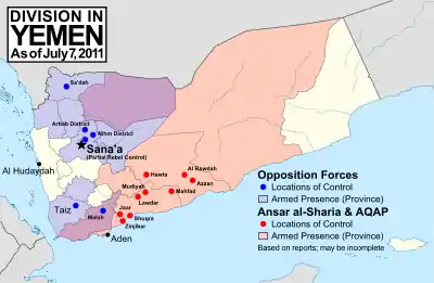 Активность исламистов резко возросла после покушения на президента Салеха 3 июня 2011 года и его последующей эвакуации. Власть над Абьяном практически полностью перешла в руки исламистов во главе с сыном последнего султана Фадли Тариком аль-Фадли, лидером исламистской группировки «Ансар аш-Шариа» («Сторонники шариата»), которого с президентом Салехом связывают родственные и деловые отношения[4].