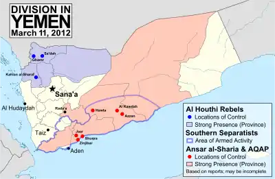 После эвакуации серьёзно раненного при покушении 3 июня 2011 г. Салеха в Саудовскую Аравию, вооружённые отряды «Ансар аш-Шариа» («Сторонники шариата») были использованы им для усиления хаоса и исламистской угрозы на юге страны. Целью Салеха было показать Вашингтону, что без него страна попадёт под контроль экстремистов[4]. Эту же политику Салех продолжает и после ухода с поста президента республики. Приход к власти Аль-Хади, влекущий для местной элиты Абьяна передел как властных полномочий, так и полномочий собственности, вызвал неоднозначную реакцию старой элиты Абьяна.
