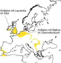 Двигаясь к северу, Авалония постепенно сближалась другим континентом — Балтикой. В конце ордовикского и начале силурийского периода произошло столкновение восточной оконечности Авалонии с Балтикой, которая в то время находилась в промежутке от 30° до 55° южной широты, постепенно поворачиваясь против часовой стрелки. Любопытно, что в течение этих перемещений бо́льшая часть всех континентов располагалась у экватора, а Сахара над южным полюсом[3].