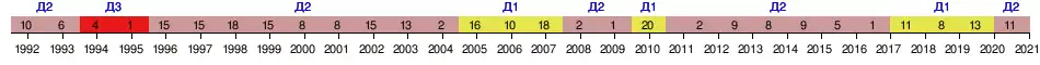 | 1994 | Третья лига, 2-я зона | 4 | 32 | 19 | 4 | 9 | 51−39 | 42 | 1/128 |
