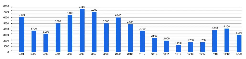 Посещаемость домашних матчей «Авангарда», среднее количество зрителей на игре чемпионата страны в течение сезона:[8]