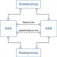 В межсетевых экранах Cisco ASA аварийное переключение осуществляется между двумя идентичными устройствами, соединёнными специальной линией (канал аварийного переключения, англ. failover link) и, при необходимости, дополнительной линией передачи состояния (канал аварийного переключения с учётом состояния, англ. stateful failover link). Линия передачи состояния предусмотрена для минимизации потерь трафика в момент аварийного переключения: по ней происходит постоянный обмен информацией обо всех установленных сеансах связи. Эта линия может быть как выделенной, так и совмещённой со специальной.