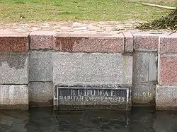 | Главный пролёт шлюза | Вид на запирающие ворота | Памятная табличка на польском на уровне воды. |