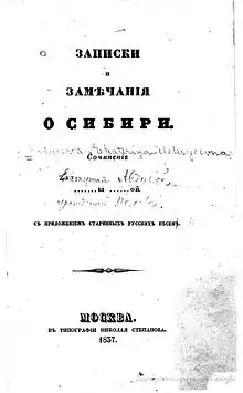 - Записки и замечания о Сибири // Записки иркутских жителей / Сост., примеч., послесл. М. Д. Сергеева. — Иркутск: Вост.-Сиб. кн. изд-во, 1990. — тираж 50 000 экз. — (Литературные памятники Сибири). — ISBN 5-7424-0216-3. — С. 3—124.