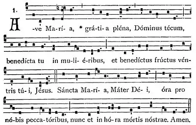 В традиционном католическом богослужении известны несколько монодических распевов (т. н. григорианских хоралов). Наиболее старые распевы не содержат позднейшей части (начиная со строки «Sancta Maria») — это тракт II тона (LU, 1412), два оффертория VIII тона (LU, 355 и 1318) и антифон I тона (LU, 1416; датируется X веком[7]). В XVI веке мелодия последнего была дописана, чтобы охватить «тридентское» расширение молитвы, при этом амбитус увеличился (антифон опубликован в приложении к LU, p. 1861; см. нотный пример).