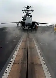Взлёт самолётов с полётной палубы авианосца может производиться с использованием стартовых ускорителей и стартовых катапульт и/или так и без их использования (например посредством взлетного трамплина).