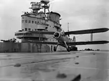 По правому борту в центральной части корабля располагалась довольно высокая надстройка островного типа, которой постарались придать аэродинамическую форму. Дымовая труба, по сравнению с «Арк Роял» была выше, что уменьшало риск задымления полётной палубы. Для запуска самолётов в передней части палубы была расположена катапульта.