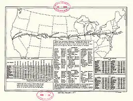 ![]() Карта Почтовой службы США с маршрутом первого трансконтинентального авиапочтового сообщения из Нью-Йорка в Сан-Франциско, открытого 1 июля 1924 года |