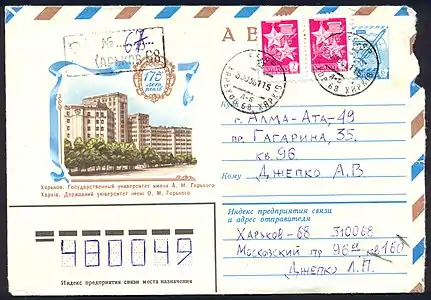 Художественный маркированный конверт авиапочты СССР в честь 175-летия Харьковского университета (1979), использованный для заказного письма от 30 марта 1981 года