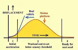 Динамика движения платформы тренажёра продемонстрирована на графике. На графике видно, что система подвижности имитирует перегрузку на небольшом участке времени (меньше секунды), на котором ускорение разгона платформы достигает ускорения моделируемого ВС. Далее в связи с ограниченностью рабочего хода платформы, она тормозится и возвращается в нейтральное положение. При этом торможение и возврат платформы осуществляются с ускорением ниже порога восприятия человека.