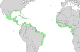 Являясь одним из самых солеустойчивых мангровых растений, авиценния блестящая произрастает в основном в расположенных наиболее близко к морю участках приливно-отливной зоны, однако встречается и в более высоких местах. На атлантическом побережье Америки её ареал простирается от 32°20' с. ш. на Бермудах и Флориде до 21°37' ю. ш. в Бразилии, захватывая Карибские острова, на тихоокеанском — от 30°15' в Мексике до 5°32' ю. ш. в Перу, захватывая архипелаг Галапагос, остров Кокос и остров Мальпело. На атлантическом берегу Африки встречается в странах Ангола, Бенин, Того, Камерун, Кот-д’Ивуар, Республика Конго, Демократическая Республика Конго, Экваториальная Гвинея, Гвинея, Гвинея-Бисау, Габон, Гамбия, Гана, Либерия, Мавритания, Нигерия, Сан-Томе и Принсипи, Сенегал и Сьерра-Леоне[3].