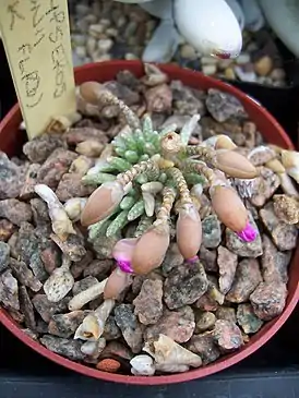 Небольшое суккулентное растение с большой корневой системой — каудексом и многочисленными зелёными или белыми тонкими, извилистыми побегами. Побеги растения покрыты треугольными остроконечными чешуйками, защищающими растение от прямого солнца и потери влаги. В период цветения на вершинах побегов появляются крупные бутоны, раскрывающиеся в розовые или белые цветки с 5 продолговатыми лепестками.
