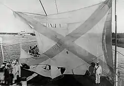 - Первый Андреевский флаг на Авроре был поднят еще до достройки крейсера во время церемонии спуска на воду 11 мая 1900 года. Но этот флаг был гораздо большего размера и символизировал ВМФ России в целом, а не был флагом этого корабля.