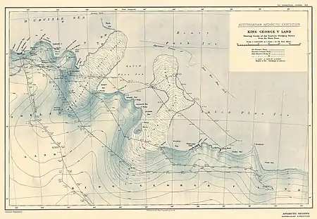 | Берег Георга V, Земля Королевы Мэри, Земля Уилкса, море Дейвиса, море Дюрвиля | |