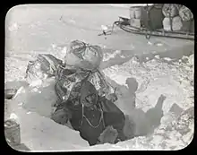 Боли в дальнейшем настолько измучили Нинниса, что 13 декабря Моусон вскрыл ему палец, что принесло значительное облегчение. 14 декабря была солнечная погода, температура +21 °F (−6 °C). Поскольку отряд находился в зоне трещин, Мерц пошёл вперёд на лыжах. Моусон не понял знаков, которые он подавал, и спокойно пересёк большую трещину шириной около 11 футов (3,3 м) по снежному мосту. Следовавший за ним Ниннис, управлявший нартами с запасами продовольствия, совершенно бесшумно провалился в трещину вместе с упряжкой. Промеры леской показали, что её глубина превышала 150 футов (45 м). Ниннис и собаки не проявляли никаких признаков жизни, а рассмотреть подробности было невозможно даже в полевой бинокль. В 21 час Моусон и Мерц прочитали над краем трещины заупокойную молитву[69].