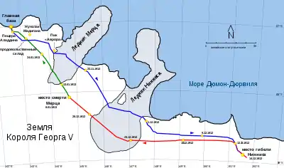 - Дальняя восточная партия — Моусон, Ниннис и Мерц. Состояла из самых опытных лыжников и каюров экспедиции, должна была пройти к дальнему побережью через материковые льды[62].