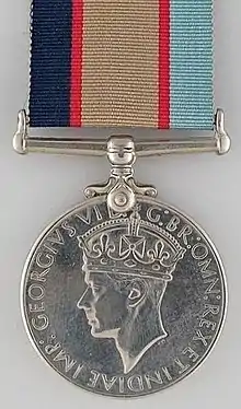 - Медальная лента шириной 32 миллиметра (1,3 дюйма) имеет широкую центральную полосу цвета хаки, в окружении двух узких красных полос, с краевыми полосами темно-синего цвета слева и светло-голубого цвета справа. Хаки представляет армию, а красный, темно-синий и светло-голубой представляют соответственно Торговый флот, ВМС и ВВС.[3]