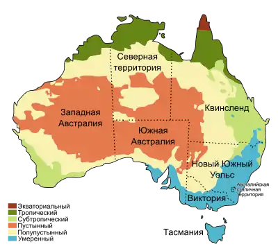 Климат Австралии находится под значительным воздействием океанических течений, в том числе диполя Индийского океана и Эль-Ниньо, которые создают периодические засухи и сезонное тропическое низкое давление, которое приводит к формированию циклонов в северной части Австралии[105][106]. Эти факторы вызывают заметное изменение количества осадков от года к году. Большая часть севера страны обладает тропическим климатом с преимущественно летними осадками[107]. Почти три четверти Австралии представляют собой пустыни и полупустыни[108]. В юго-западной части страны климат является средиземноморским[109]. В большей части юго-востока страны (включая Тасманию) климат умеренный[107]. На засушливость региона влияет холодное Западно-Австралийское течение, которое не даёт энергии для образования циклона. Нечто подобное происходит и на западе Южной Америки, но там всё меняется с появлением Эль-Ниньо.