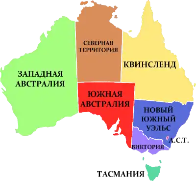 Австралия состоит из шести штатов, двух материковых территорий и других более мелких территорий. Штатами являются Виктория (VIC), Западная Австралия (WA), Квинсленд (QLD), Новый Южный Уэльс (NSW), Тасмания (TAS) и Южная Австралия (SA). Двумя главными материковыми территориями являются Северная территория (NT), и Территория федеральной столицы (ACT). Статус территорий во многом аналогичен статусу штатов, за исключением того, что федеральный парламент может отменить любое решение парламента территории, в то время как по отношению к штатам федеральное законодательство имеет верховенство над законодательством штатов только в тех случаях, которые указаны в параграфе 51 Конституции. Все остальные вопросы остаются в ведении штата, например, здравоохранение, образование, правопорядок, общественный транспорт, дороги, судоустройство и местное самоуправление.