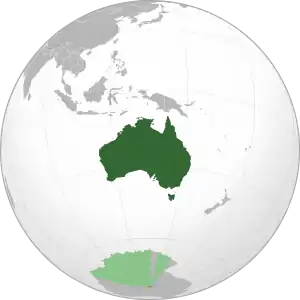 Австралийский Союз — государство в Южном полушарии площадью 7 692 024 км²[91]. Австралия является шестым по площади государством в мире после России, Канады, Китая, США и Бразилии, занимая около 5 % поверхности суши Земли[92]. Также является крупнейшим по территории государством, полностью расположенном в Южном полушарии. В него входят: материк Австралия (включая остров Тасмания) площадью 7 659 861 км²[91] и другие прибрежные острова площадью 32 163 км²[91]. Под контролем Австралии находятся несколько внешних территорий: Кокосовые (Килинг) острова площадью 14 км²[93], остров Рождества площадью 135 км²[94], острова Ашмор и Картье площадью 199 км²[95], территория островов Кораллового моря площадью 7 км²[96] (площадь акватории около 780 тыс. км²), остров Херд и острова Макдональд площадью 372 км² (входят в состав Австралийской антарктической территории)[97], остров Норфолк площадью 35 км²[98] и Австралийская антарктическая территория площадью 5 896 000 км²[99] (суверенитет Австралии над этой территорией не признаётся большинством стран мира)[100]. Общая площадь всех внешних территории 5 896 762 км² (без Антарктической территории — 762 км²).