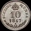 10 крейцеров[коммент. 8] | 18 | 2 | н/д | рубчатый | серебро 500-й пробы | 1867 A | 58 500[7] |