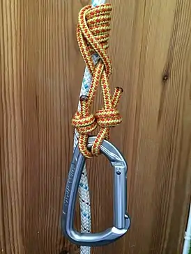 Автоблок (англ. Autoblock)[17] или узел Машáра — по существу тот же узел, но на последнем этапе обе петли прощёлкивают в карабин, а не одна через другую.
