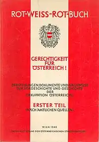 Декларация 27 апреля осторожно отвергла требование Московской декларации о собственном вкладе Австрии в её освобождение: поскольку, утверждали отцы Второй республики, в 1938—1945 годы австрийская государственность временно прервалась, то возрождённая Австрия не должна отвечать за преступления «оккупантов»[62][63]. В мае — июне 1945 года временное правительство закрепило это положение в официальной «доктрине оккупации» (нем. Okkupationsdoktrin)[62]. Вся вина и вся ответственность за преступления оккупационного режима, утверждали австрийцы, лежала на Германии — единственной преемнице гитлеровского рейха[62][64]. Практическим следствием «доктрины оккупации» стала позиция МИД Австрии по еврейскому вопросу: поскольку преследование евреев было делом рук не австрийцев, а германских оккупантов, то «в соответствии с международным правом австрийским евреям следует направлять требования о репарациях не Австрии, но германскому рейху»[11]. Для убеждения стран-победителей министр иностранных дел Карл Грубер организовал составление и издание «Красно-бело-красной книги»[65][66]. Тщательно и пристрастно скомпилированная подборка реальных документов и «исторических» комментариев, по замыслу австрийских политиков, должна была убедить власти стран-победителей в насильственном характере аншлюса (что соответствовало действительности) и о массовом неприятии австрийцами гитлеровского режима (что действительности не соответствовало)[65][комм. 6]. Составители «Книги» утверждали, например, что в 1938 году 70 % австрийцев не просто не поддерживали аншлюс, но якобы испытывали к нему «фанатичную вражду»[65]. Так был заложен миф, ставший идеологическим фундаментом послевоенной Австрии[67][66].