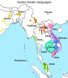 Аустроазиатские языки включают более 150 языков и, в соответствии с общепризнанной в современной науке классификацией, делятся на три основные ветви: мунда, мон-кхмерскую и никобарскую. Ранее в состав аустроазиатских языков ошибочно включался язык нахали.