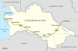 | Через | Балканабад, Бахерден, Ашхабад, Теджен, Мары, Байрамали |