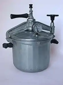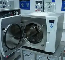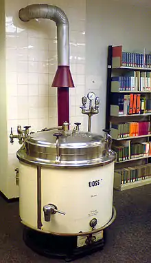 Автокла́в (греч. авто — сам + лат. clavis — запор, задвижка[1]) — герметичный аппарат для различных операций, требующих нагрева под давлением выше атмосферного[1]. В этих условиях достигается ускорение реакции и увеличение выхода продукта. При использовании в химии или для проведения химических реакций используют название химический реактор. При использовании в медицине для стерилизации при высоком давлении и температуре — только автоклав. В случае, если стерилизация проводится при высокой температуре, но без давления, используют термин стерилизатор или сухожаровой шкаф (без пара), дезинфекционная камера (для дезинфекции). Был изобретён Дени Папеном в 1679 году.